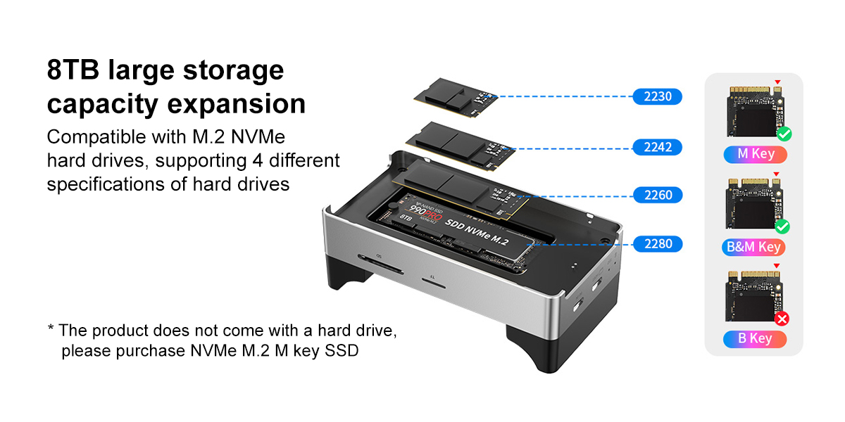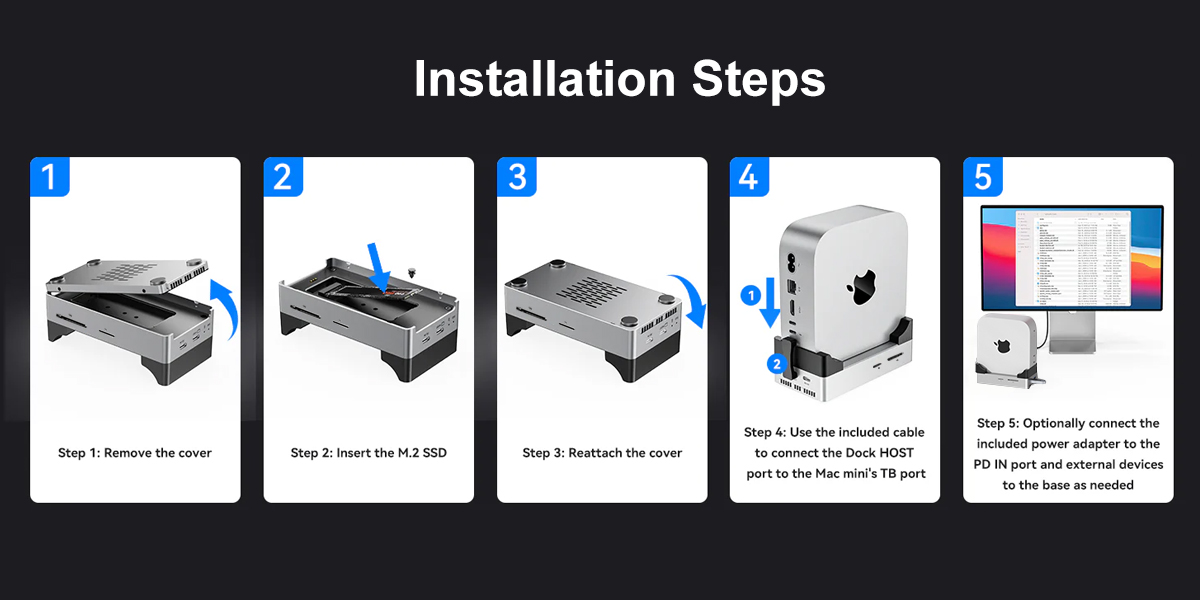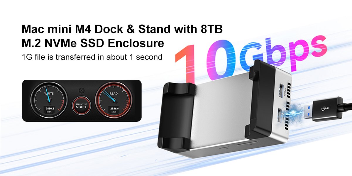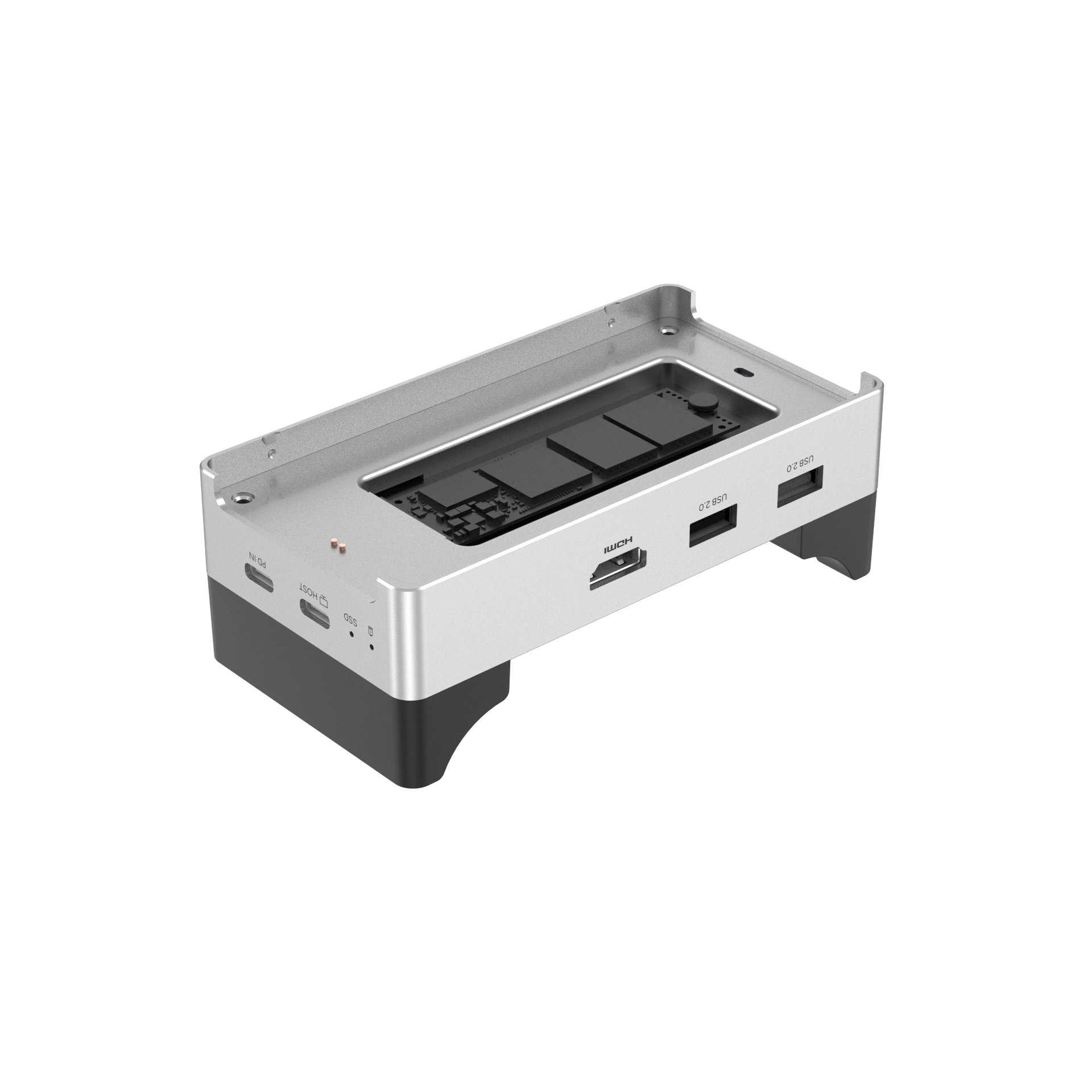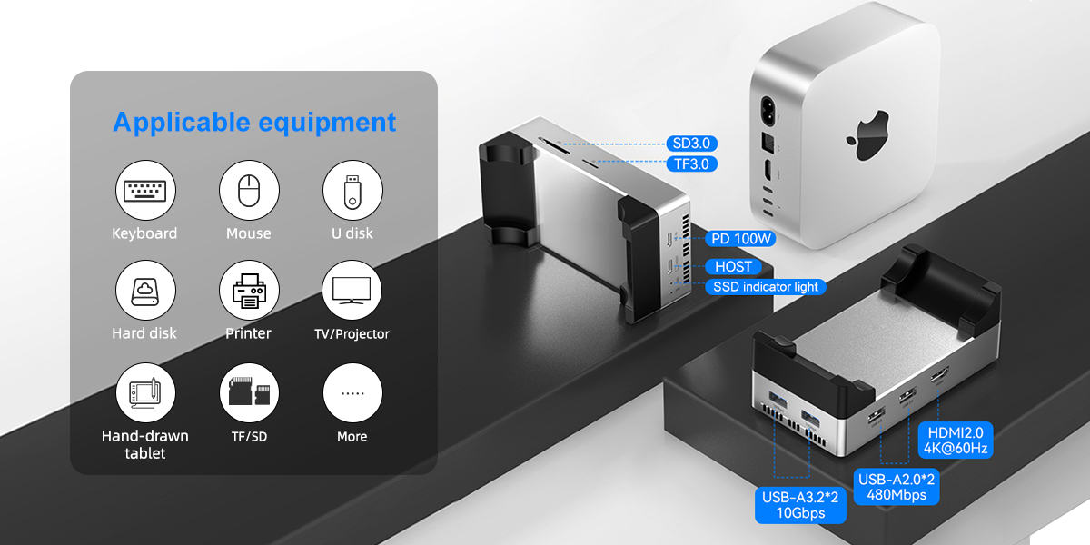 High-strength aluminum alloy structural design + built-in intelligent temperature-controlled cooling fan, perfectly compatible with Mac mini. The enclosure features a high-strength aluminum alloy frame with an anodized surface finish, offering scratch and wear resistance while maintaining a compact, elegant appearance. The built-in intelligent temperature-controlled cooling fan enables active temperature monitoring and real-time thermal management, utilizing multi-layer heat dissipation to rapidly expel heat. This design ensures durability, eco-friendliness, stable data transmission, and excellent compatibility.