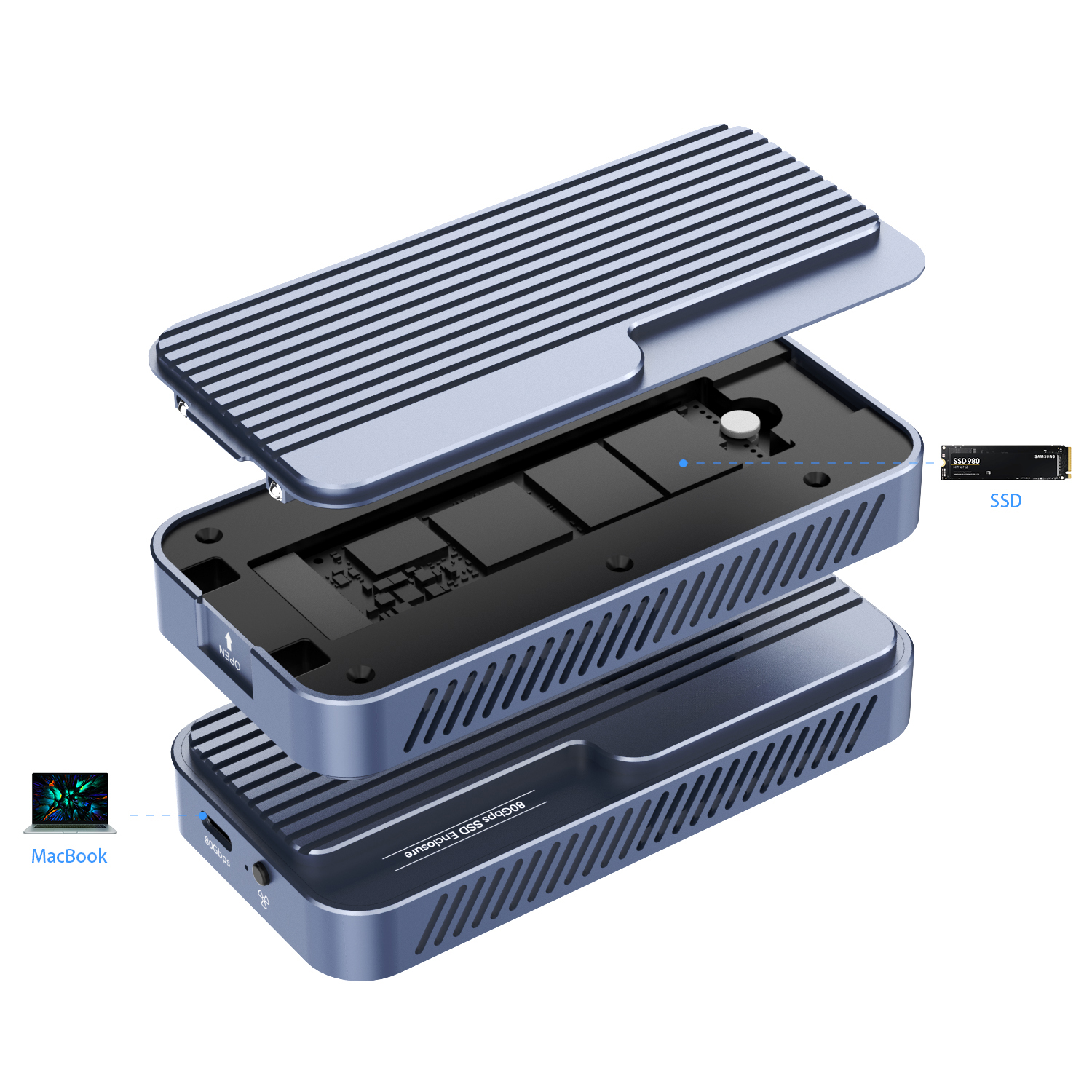 Equipped with a TBT5/USB4 USB-C port, this enclosure delivers 80Gbps transfer speeds when connected to compatible hosts, supporting Thunderbolt 4/3, USB4 2.0/1.0, USB3.2, and USB3.0 protocols. The integrated JHL9480+RTL9210 dual-chip architecture ensures stable, high-efficiency data handling across devices.