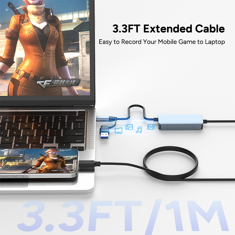 The capture output features a unique USB-A & USB-C 2-in-1 cable design. Whether you are using a leg-acy PC or a modern USB-C laptop, it ensures a seamless, driver-free "plug and play" experience right out of the box.